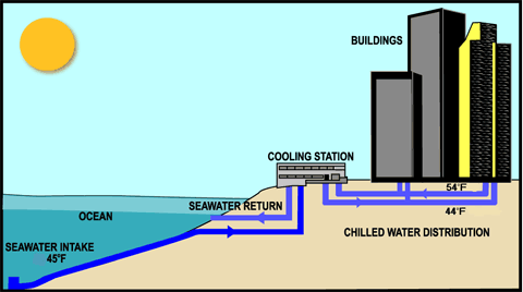 Here’s how it works: a five-foot-wide pipe extends four miles out to sea to a depth of 1,700 feet, bringing in 44,000 gallons of water every minute at 45°F (7.2°C). Once ashore, the water is fed into a conventionally powered chiller that brings it down to exactly 44°F (6.7°C), then flows through a heat exchanger with a closed-circuit freshwater system and is released back into the sea at a depth of 200 feet at 56°F (13.3°C) – the natural temperature at that depth.