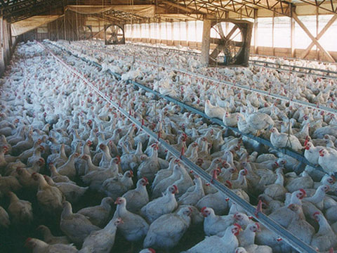 The footage shows cages that stretch almost as far as the eye can see; climbing upwards in tier after tier, with multiple gangways running between the stacks of cages. A dystopian, futuristic landscape designed with profit in mind.