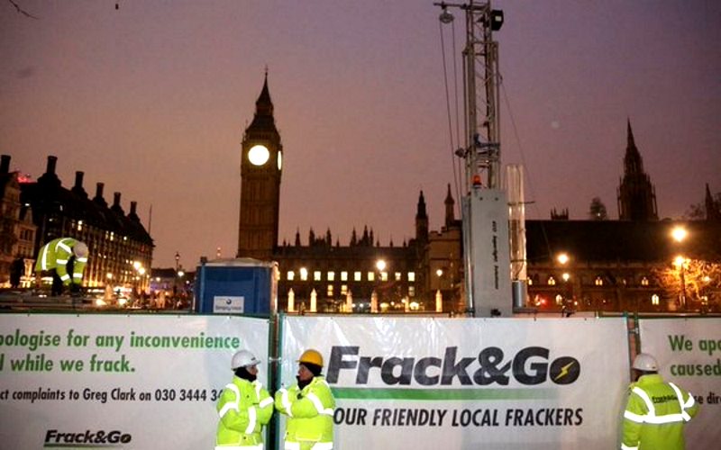 "We have installed a life-like fracking rig and drill at Parliament Square to show them what people in Lancashire and beyond will have to endure if so-called 'Communities Minister' Greg Clark forces fracking on a reluctant nation."