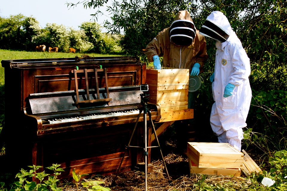She harvested live footage and sounds, from which she devised an original composition that was ‘played’ through a second piano. Audience members could view the piano-hive remotely through a Skype link fitted within this second instrument.